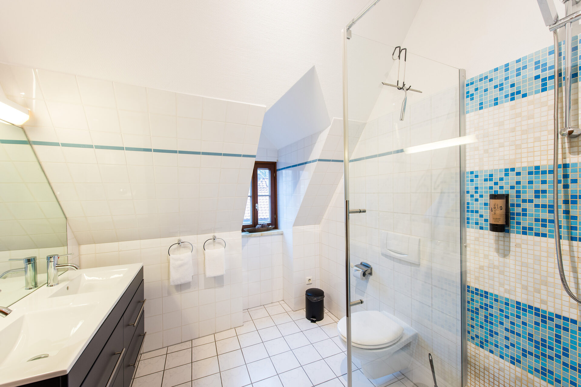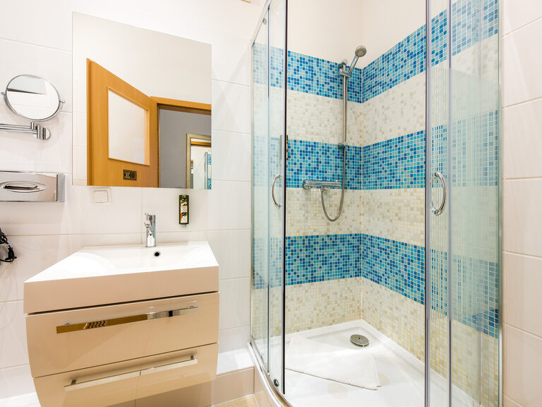 separates Badezimmer mit Dusche, Föhn und Kosmetikspiegel