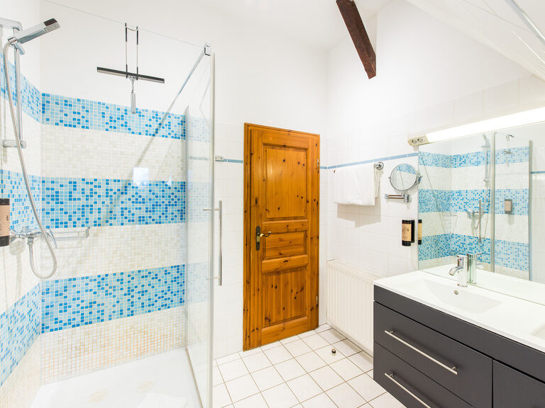 separates Badezimmer mit Dusche, Föhn und Kosmetikspiegel