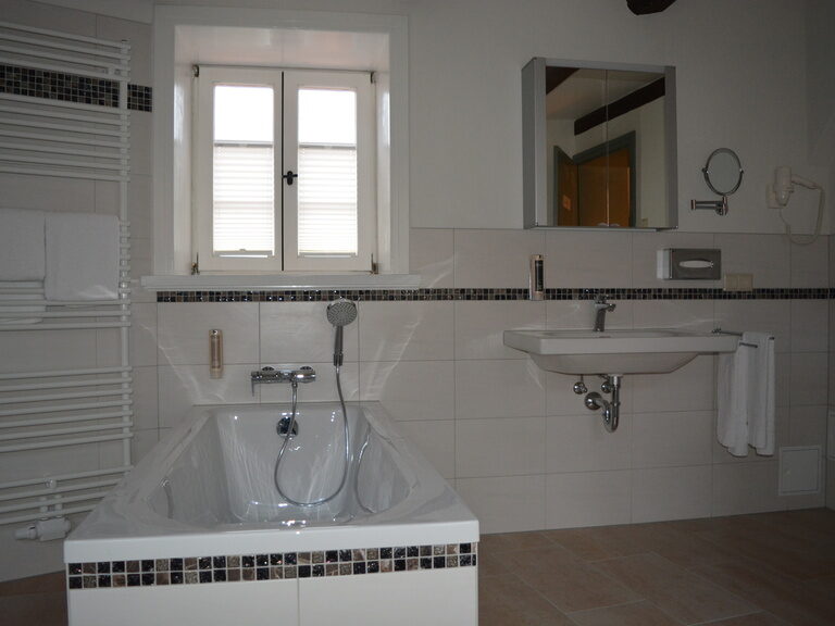 separates Badezimmer mit Badewanne, Dusche, Föhn und Kosmetikspiegel